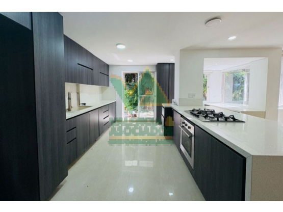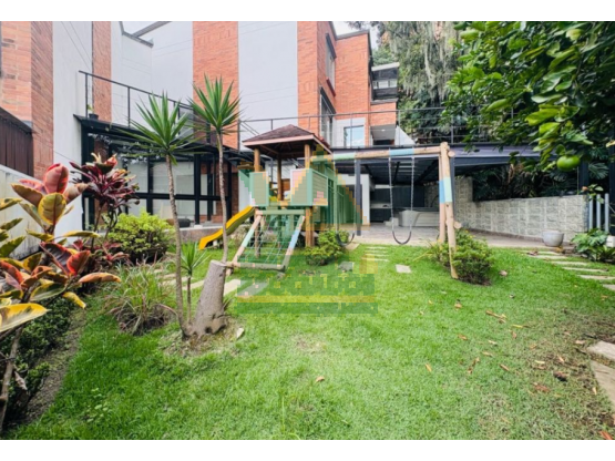 Esta casa en la parte baja de la Loma de Brujas en Envigado ofrece 282 m² en tres niveles. En el acceso cuenta con sala-comedor, baño social, una alcoba que puede usarse como estudio, zona de ropas y alcoba de servicio. La cocina conecta con una terraza de piso de vidrio, desde donde se baja al subnivel, que incluye un espacio en vidrio tipo gimnasio, zona al aire libre con juegos infantiles, bancas rústicas y un área techada con jacuzzi, BBQ y un cuarto con baño.
